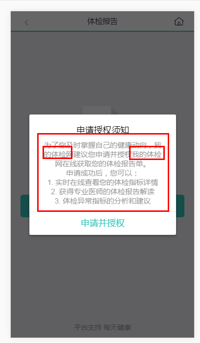 体检报告的授权信息中“我的体检网”改为“每天健康”(见下图)